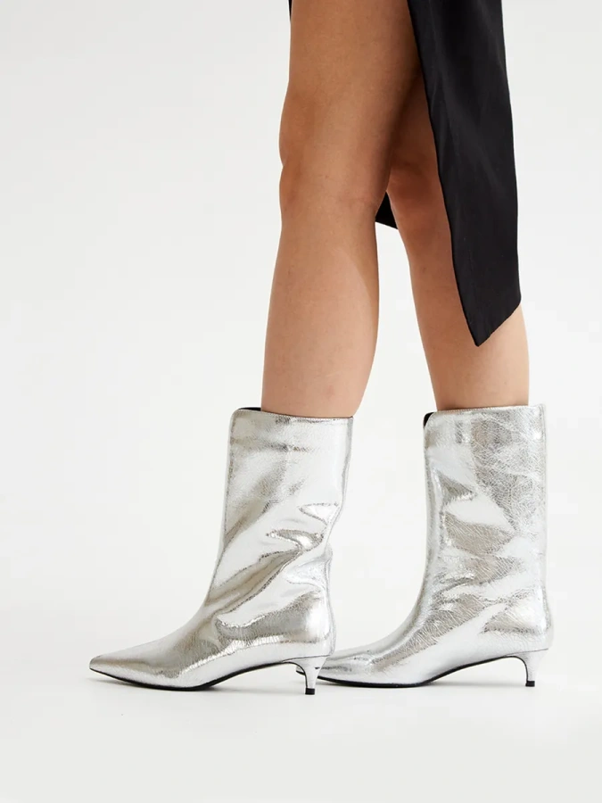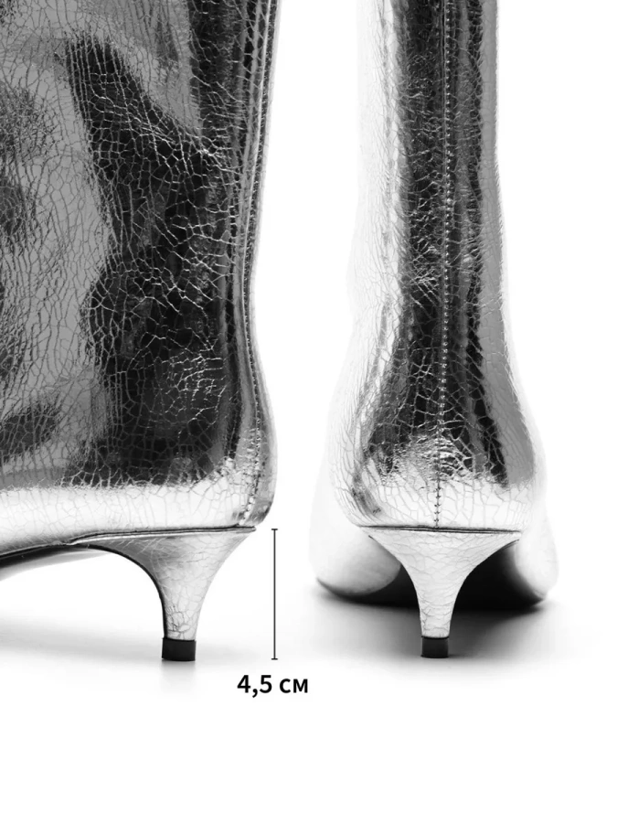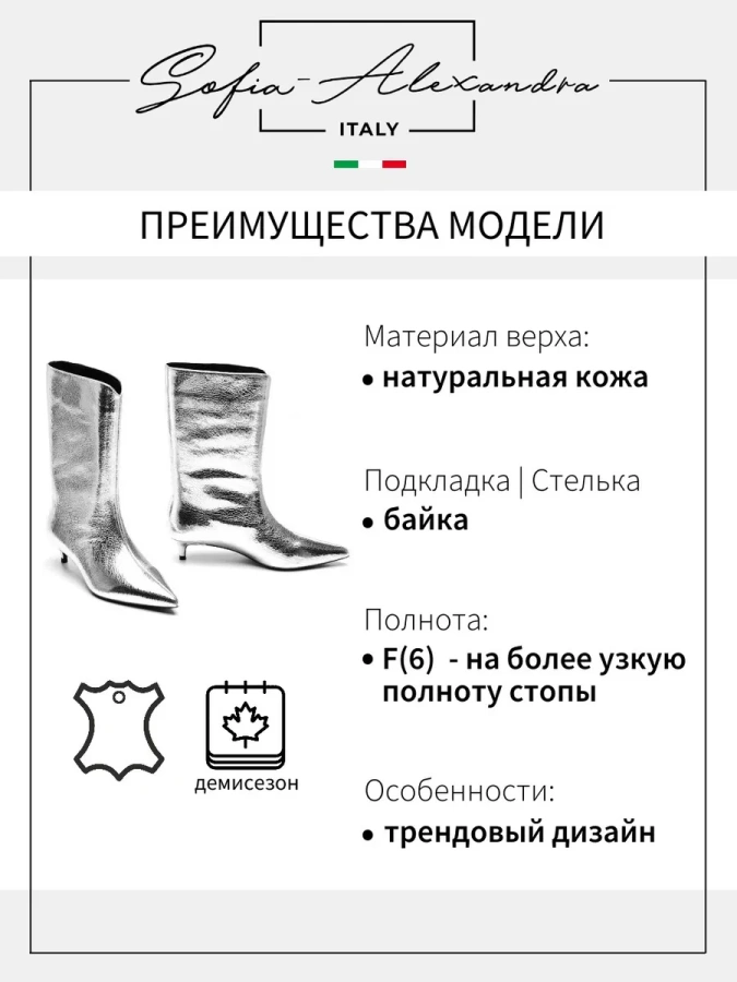 Полусапоги SOFIA-ALEXANDRA — это воплощение стиля futurism в осеннем гардеробе. Изготовленные в Италии из 100% натуральной кожи, они гарантируют долговечность и комфорт. Серебряный цвет модели добавит изюминку в ваш образ, а подкладка и стелька из байки обеспечат тепло и уют в прохладную погоду. Высота подошвы — всего 0,7 см, а каблук-рюмочка высотой 4,5 см придаёт изящество силуэту. Эти полусапоги станут отличным дополнением к вашему осеннему гардеробу и помогут создать неповторимый образ.