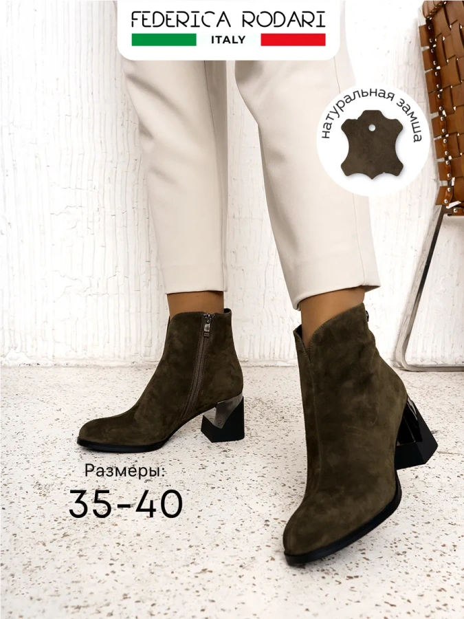 Представляем вам стильные ботильоны от итальянского бренда FEDERICA RODARI. Эти хаки ботильоны - настоящее воплощение комфорта и стиля, созданные для женщин, ценящих высокое качество и элегантность.