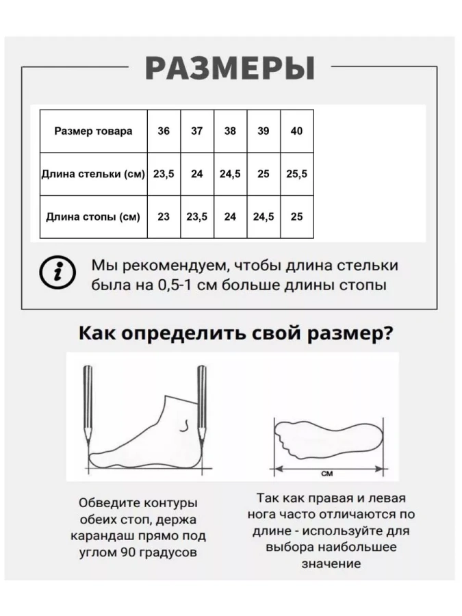 Длина стельки: 36р - 23,5см/ 37р - 24,0см/ 38р - 24,5см/ 39р - 25,0см/40р - 25,5см. Полнота H (8) (увеличенная)