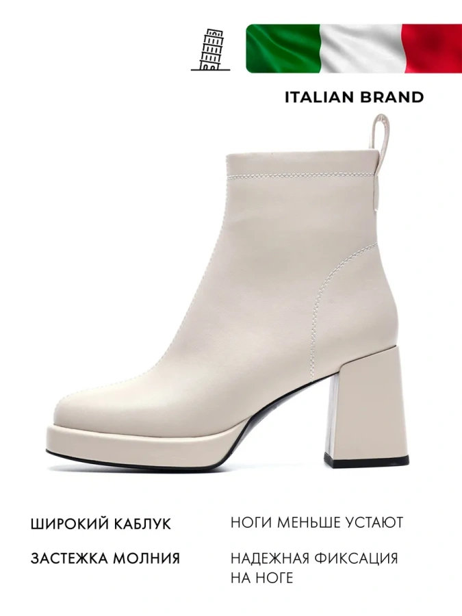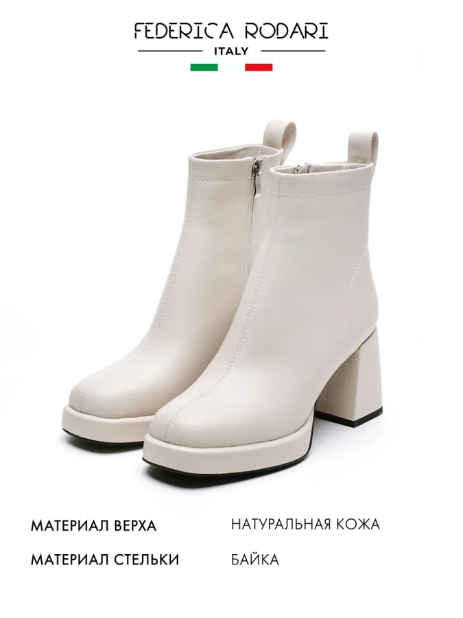 Ботильоны от бренда FEDERICA RODARI — это воплощение итальянского стиля и качества. Изготовленные из 100% натуральной кожи, они станут отличным дополнением к вашему гардеробу. Белый цвет ботильонов делает их универсальными и подходящими для создания различных образов в стиле casual. Высота каблука 8 см с трапециевидной формой придаёт элегантность и изящество, а высота подошвы в 2 см обеспечивает комфорт при ходьбе. Подкладка и стелька из байки обеспечивают тепло и комфорт в холодное время года. Молния с внутренней стороны модели делает ботильоны удобными в использовании. С этими ботильонами вы будете выглядеть модно и современно, подчёркивая свой неповторимый стиль.