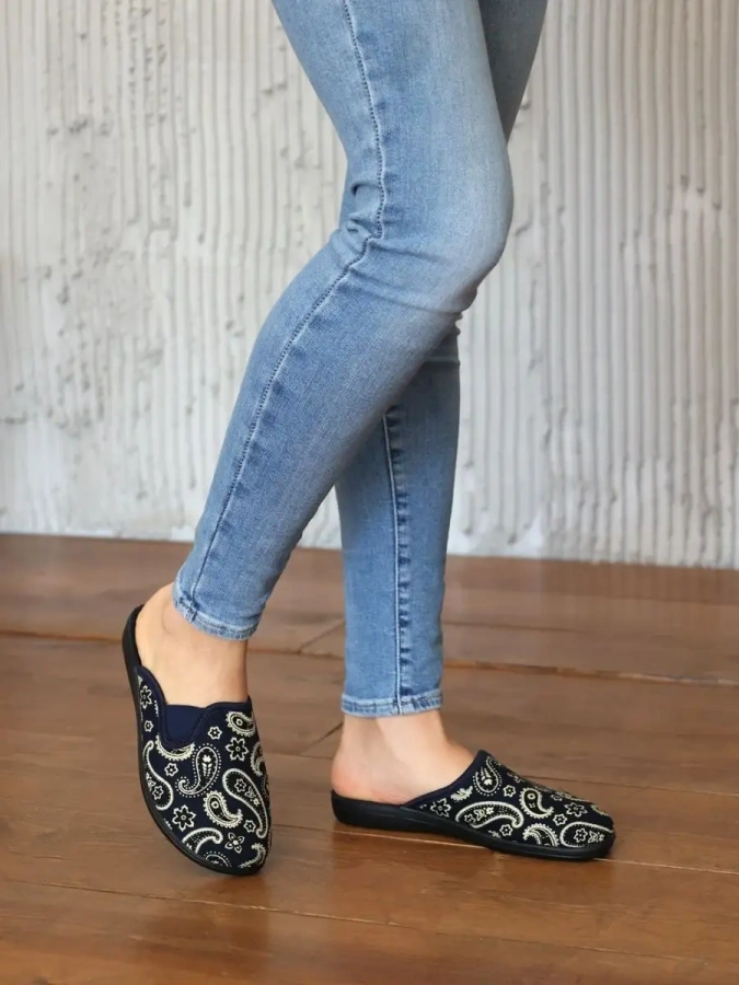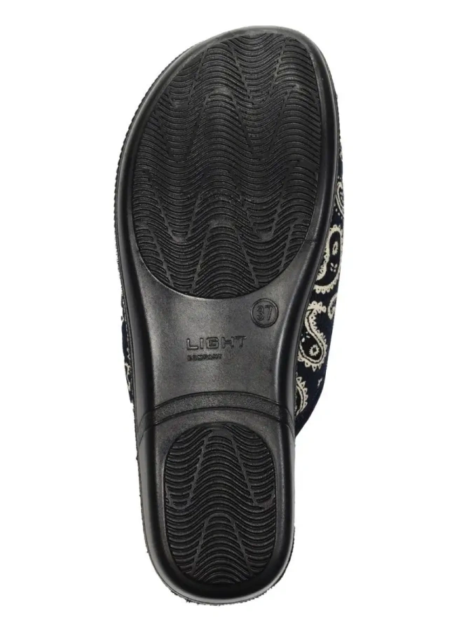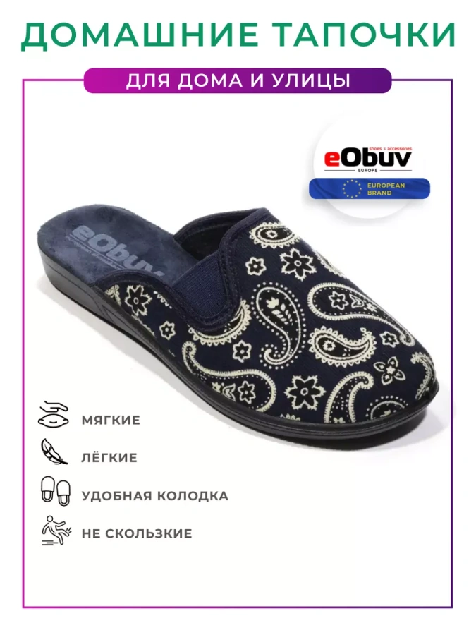 Длина стельки в см.: 37 - 23,5 / 38 - 24 / 39 - 25 / 40 - 25,5 / 41 - 26. Верх, подкладка и стелька изготовлены из мягкого и прочного текстиля, что позволяет ноге дышать и придает max комфорт во время длительного использования. Подошва из полиуретана не скользит и выполнена в виде небольшой танкетки, что снижает нагрузку на суставы, а также позволяет носить тапочки не только в помещении, но и на улице в загородном доме или на даче. Удобная колодка адаптирована под женскую стопу и повседневную эксплуатацию, вследствие чего ноги меньше устают. Подходят на стандартную полноту стопы и небольшой +/-