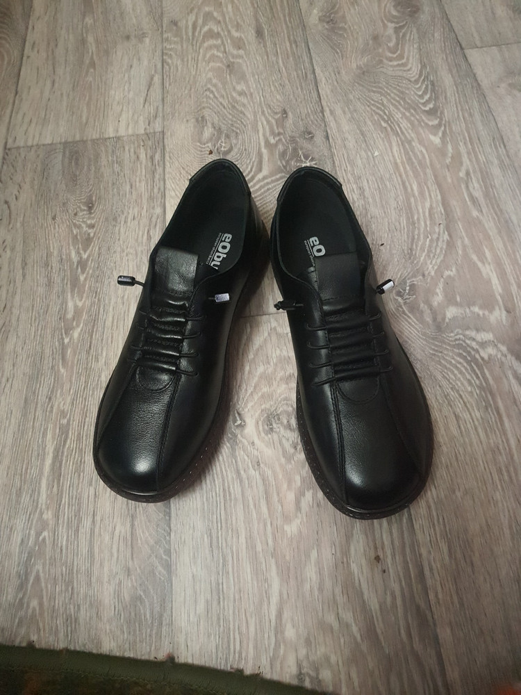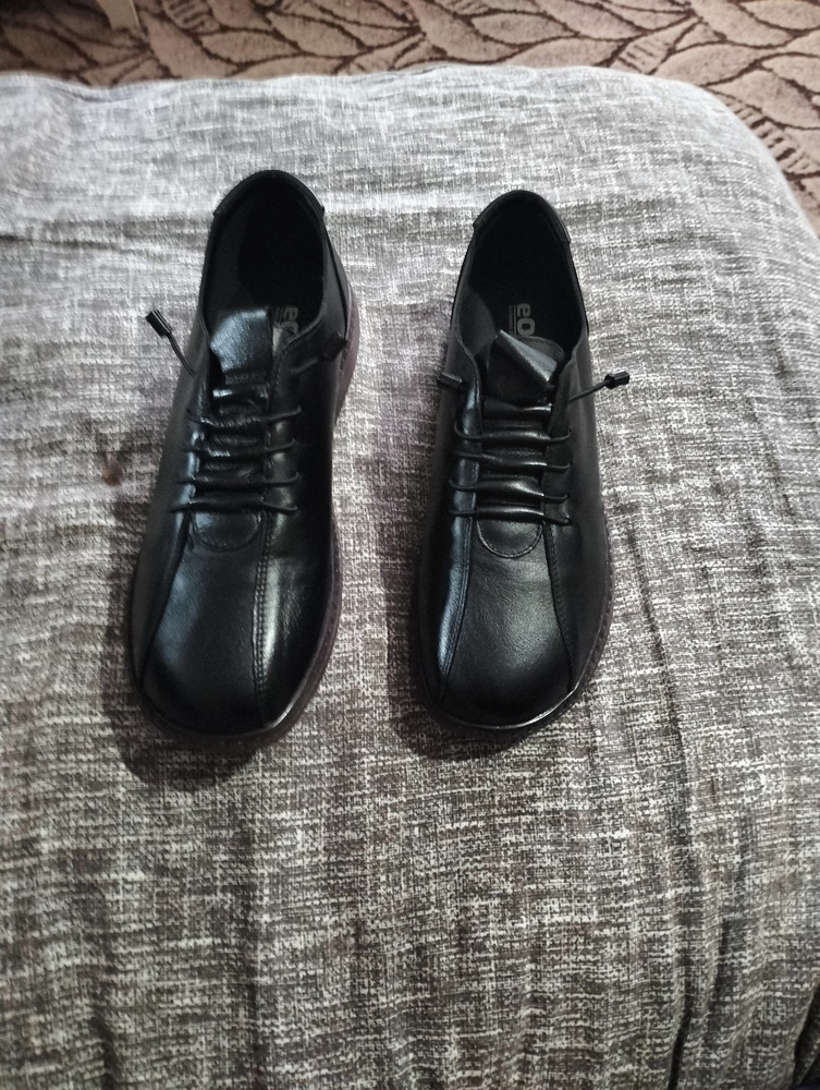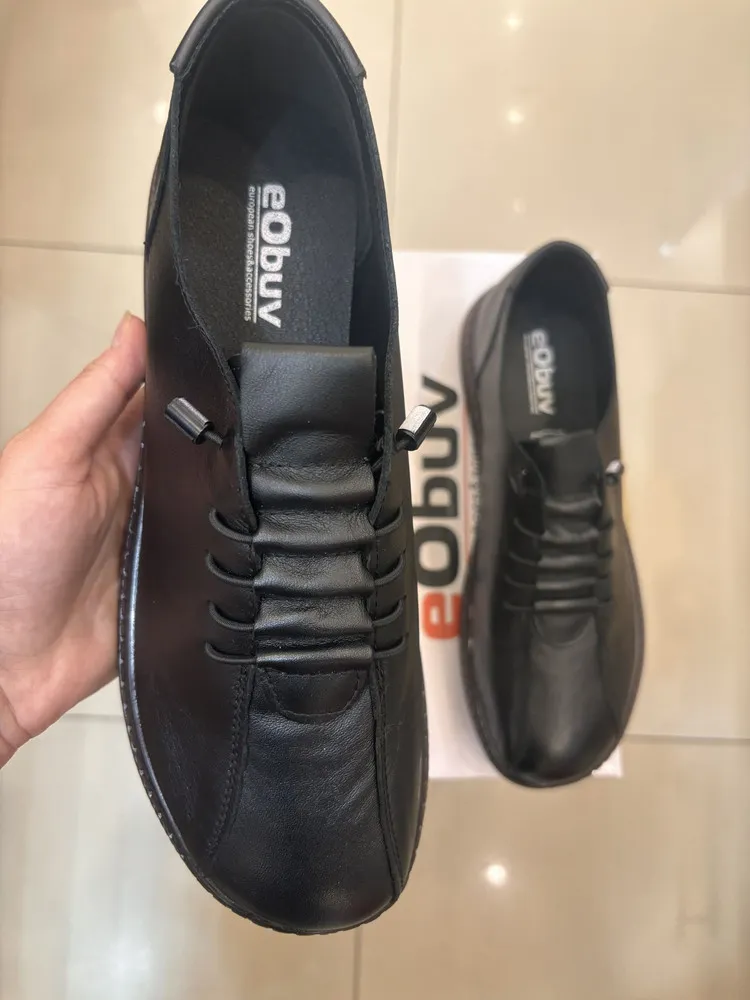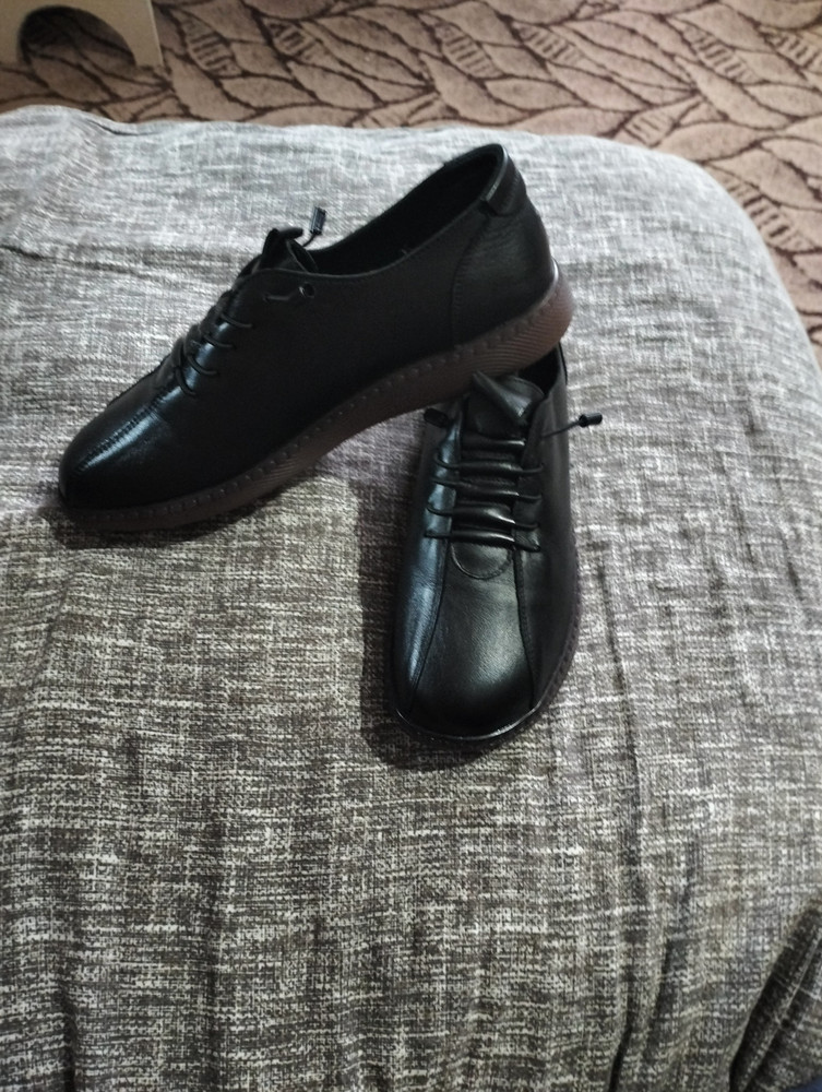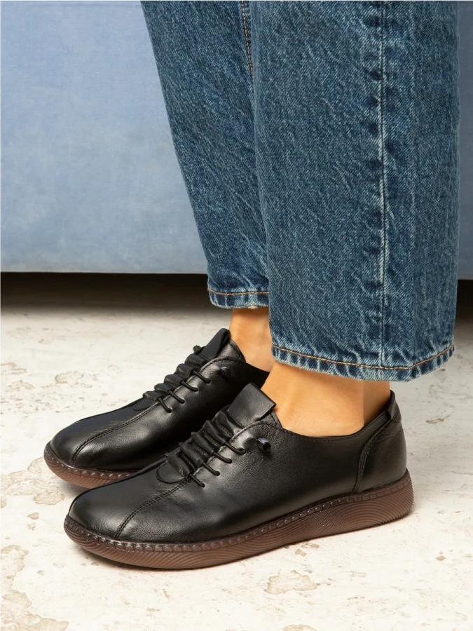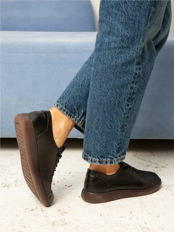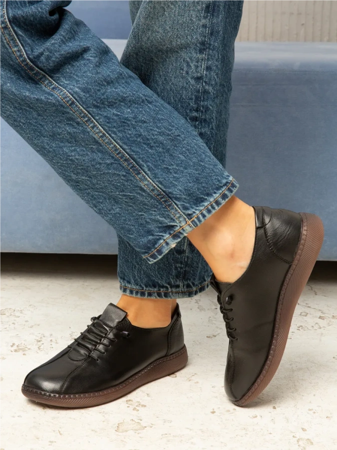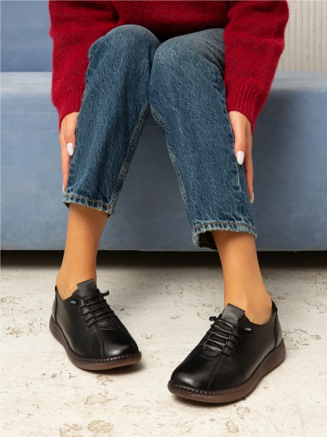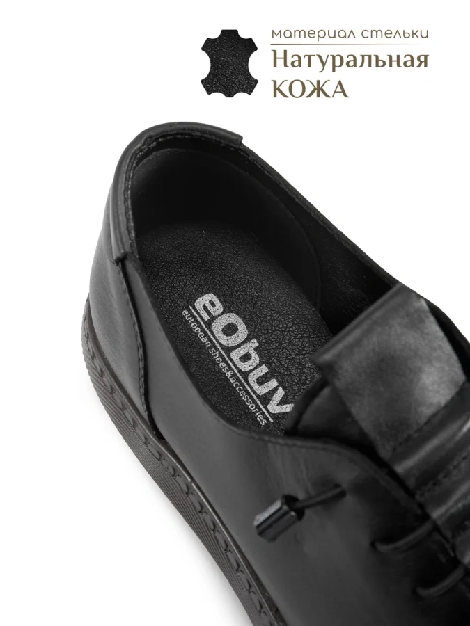 Модель изготовлена из 100% натуральной кожи, что обеспечивает её долговечность и элегантный внешний вид. Чёрный цвет делает туфли универсальными и позволяет сочетать их с разными элементами гардероба. Удобная резиновая подошва и высота каблука в 3 см обеспечивают комфорт при ходьбе и стильный образ в стиле casual. Резинка с фиксатором на застёжке гарантирует лёгкость обувания и надёжную фиксацию.