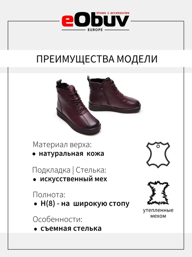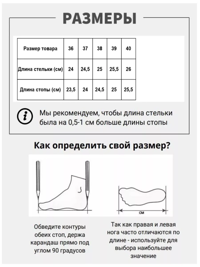 Длина стельки: 36р - 24,0см/ 37р - 24,5см/ 38р - 25,0см/ 39р - 25,5см/40р - 26,0см. Полнота G (7) (на стандартную и увеличенную полноту).