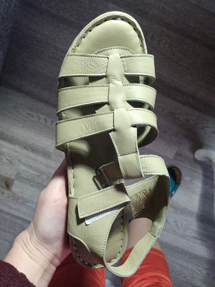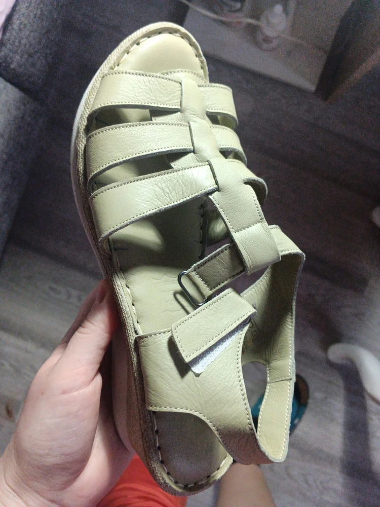 Изготовленные из 100% натуральной кожи, они обеспечивают комфорт и долговечность. Танкетка высотой 6 см и подошва из ТПР (термопластичной резины) обеспечивают удобную посадку и надёжность. Липучка в качестве застёжки делает босоножки лёгкими в использовании и обеспечивает надёжную фиксацию. Высота подошвы — 2,5 см — добавляет лёгкости и удобства в носке. Выполненные в цвете хаки, они гармонично впишутся в ваш casual-гардероб.