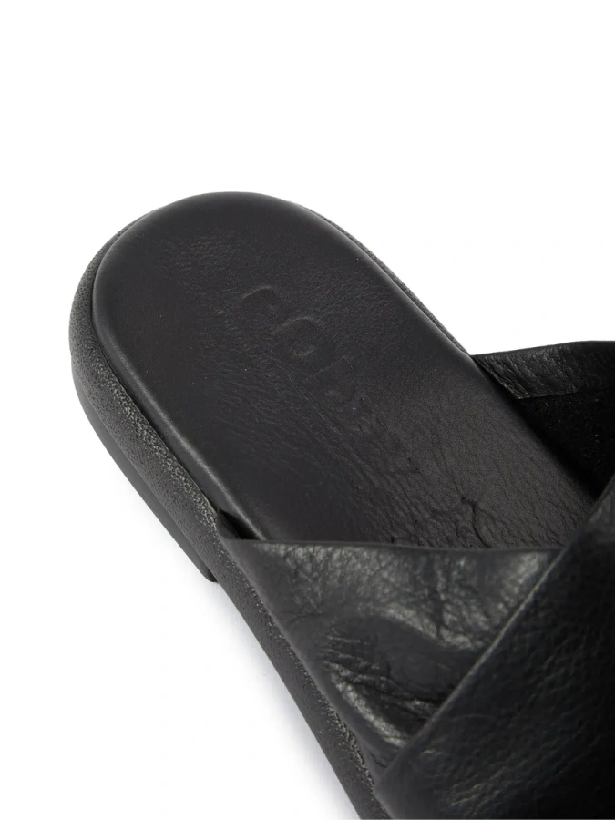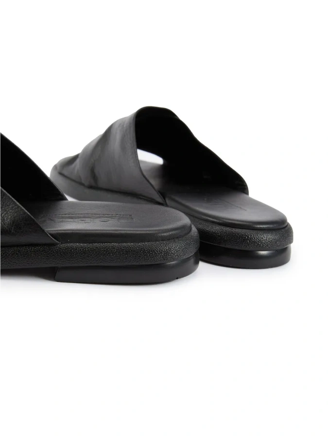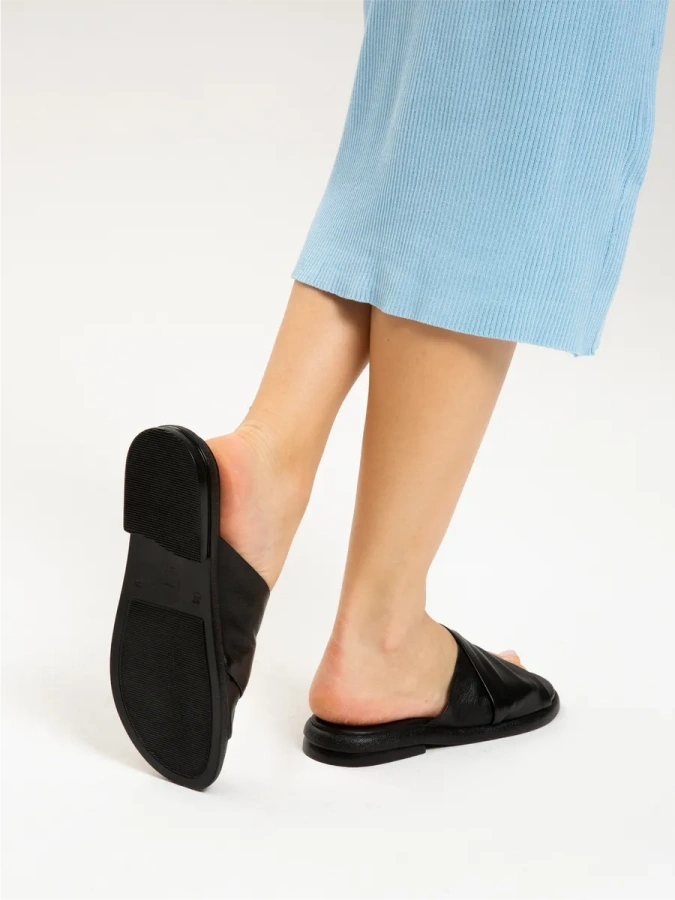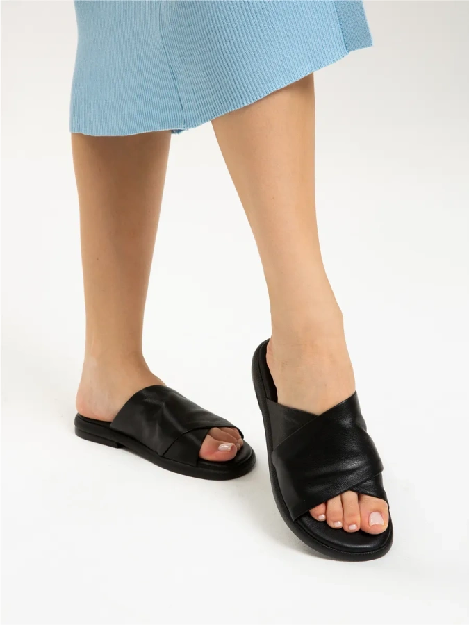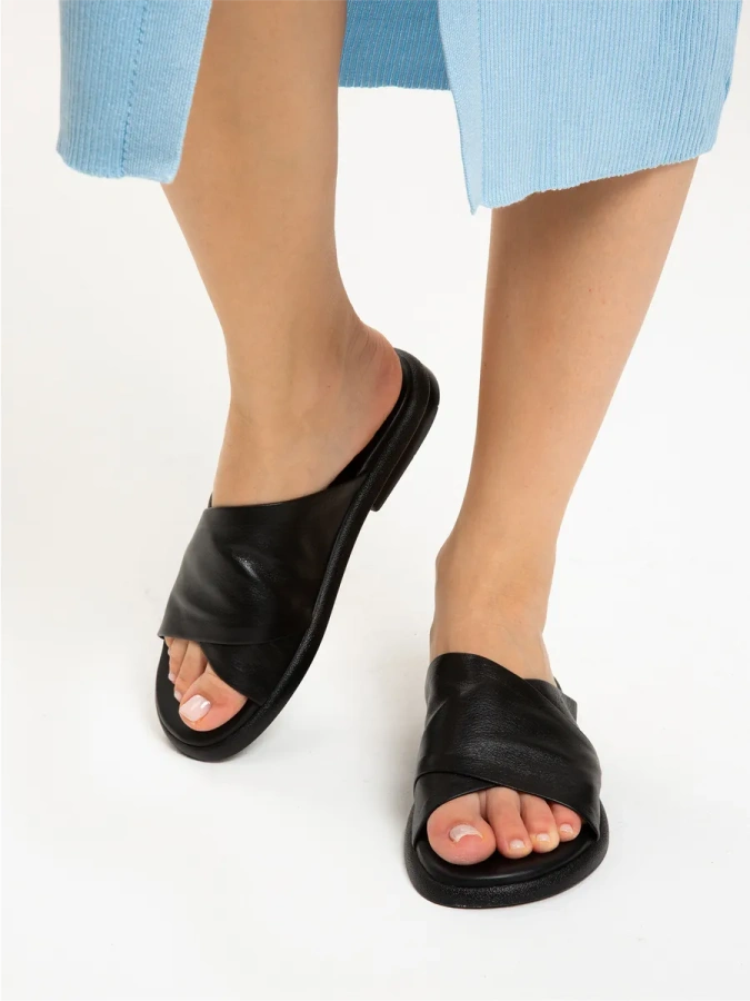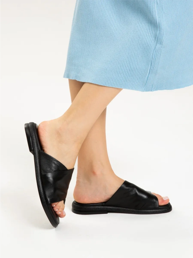 Изготовленные из 100% натуральной кожи, они обеспечивают комфорт и долговечность. Чёрный цвет делает их универсальными для любого образа в стиле casual. Высота подошвы в 1,5 см и каблука в 2,7 см (венский каблук) придают модели изящный и современный вид. Отсутствие застёжек обеспечивает лёгкость и удобство ношения. Эти шлёпанцы станут отличным дополнением к вашему летнему гардеробу.