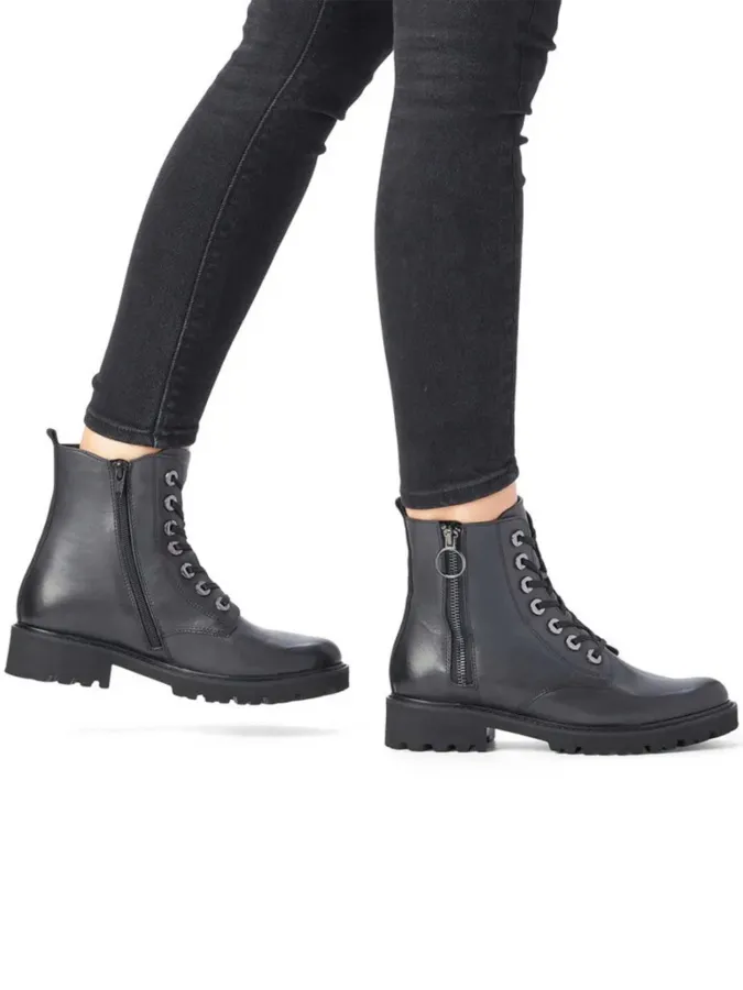 Демисезонные женские ботинки из 100% натуральной кожи от немецкого бренда REMONTE. Идеально подойдут на осень/весну и на не очень холодную (европейскую) зиму. Утепленная несъемная стелька выполнена из войлока, что повышает теплоизоляционные свойства и придает максимальный комфорт. Подошва на устойчивом каблуке, обладает износостойкостью и хорошим сцеплением. Удобная колодка адаптирована под женскую стопу и длительную носку. Две боковые молнии существенно облегчают процесс обувания, а наличие шнуровки позволяет регулировать высоту подъёма. Подходят на стандартную полноту стопы и небольшой +/-