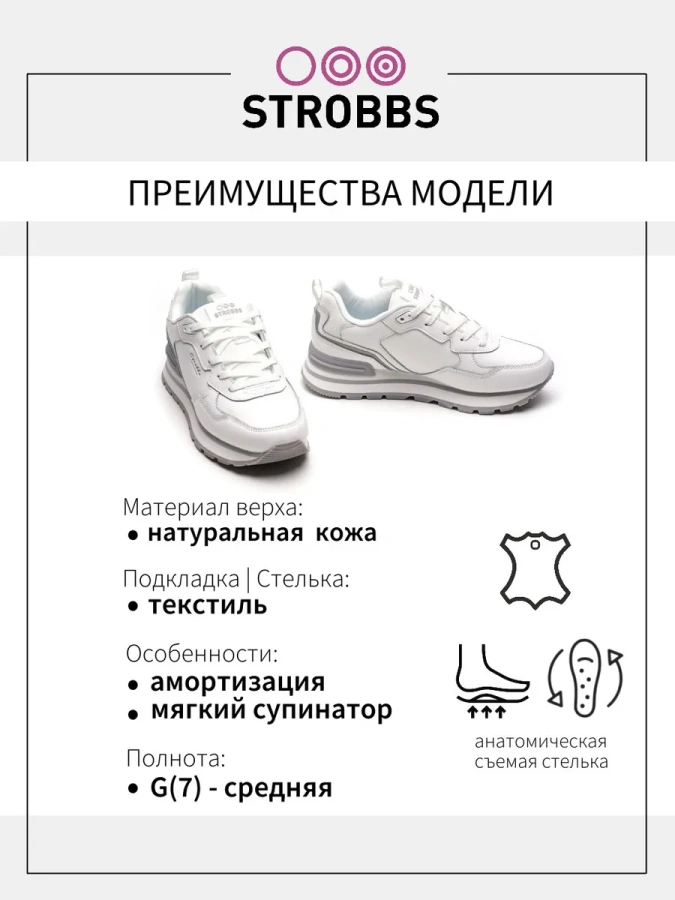 Кроссовки STROBBS — идеальный выбор для активных людей, ценящих комфорт и стиль. Изготовленные из 100% натуральной кожи, они обеспечивают долговечность и приятные тактильные ощущения. Текстиль в качестве подкладки и стельки гарантирует хорошую вентиляцию и комфорт при носке. Благодаря удобной шнуровке и продуманному дизайну, кроссовки STROBBS идеально садятся на ногу. Высота подошвы в 2 см и каблука в 4,5 см обеспечивают устойчивость и комфорт при ходьбе. Эти кроссовки станут отличным дополнением к вашему гардеробу в любое время года и впишутся в спортивный стиль вашего образа. Выбирайте качество и стиль с кроссовками STROBBS. Они станут незаменимой частью вашего гардероба и подарят комфорт в любых ситуациях.
