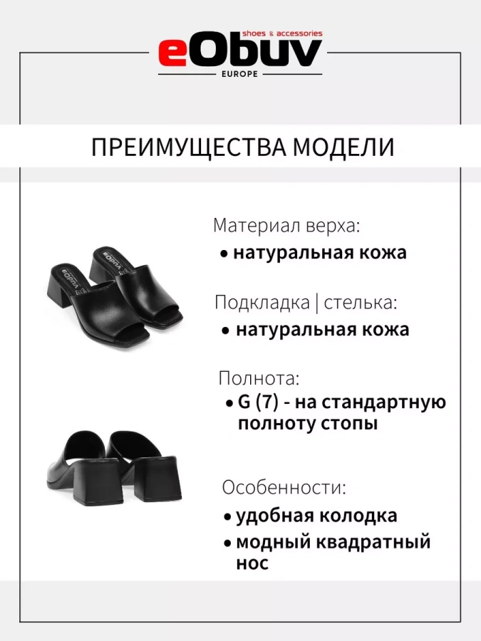 Женские сабо из натуральной кожи от бренда eObuv. Длина стельки в см.: 36 - 23,5/ 37 - 24/ 38 - 24,5 /39 - 25,5/ 40 - 26. Высота каблука - 6 см., высота подошвы - 1 см. Подкладка и мягкая стелька выполнены из натуральной кожи, что повышает прочность изделия и придает максимальный комфорт ноге в летний период. Подошва обладает износостойкостью и хорошим сцеплением с поверхностью, что делает сабо долговечными и практичными. Удобная колодка адаптирована под женскую стопу и длительную носку. Подходят на стандартную полноту стопы и небольшой +/-.