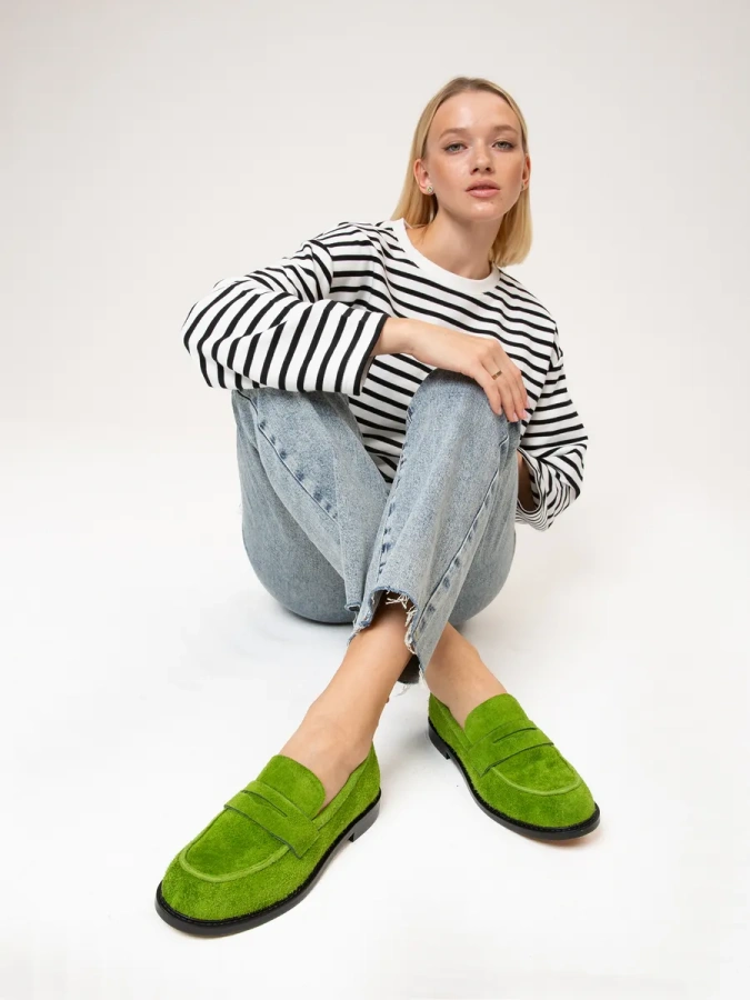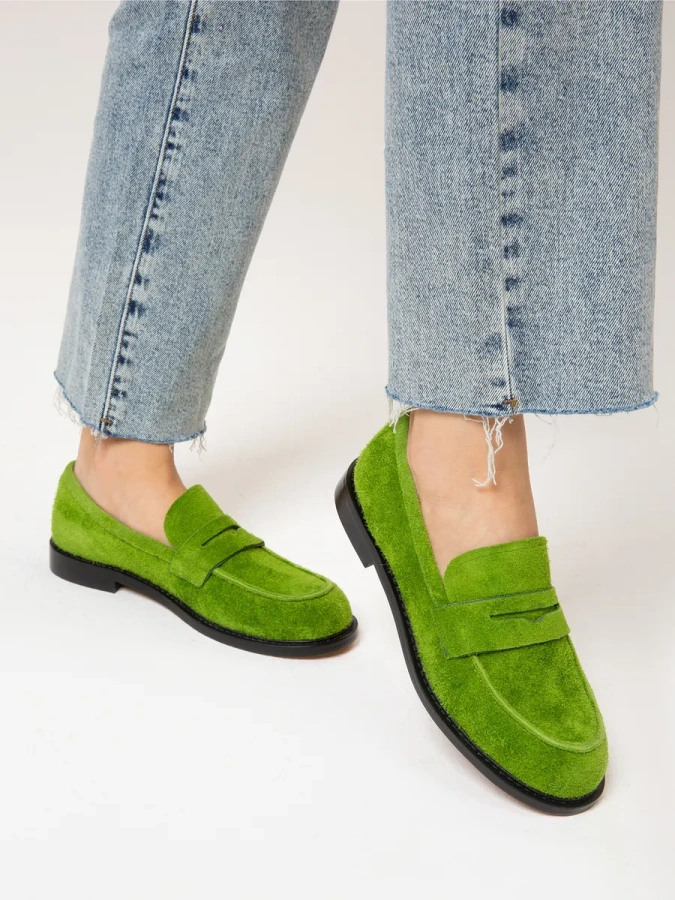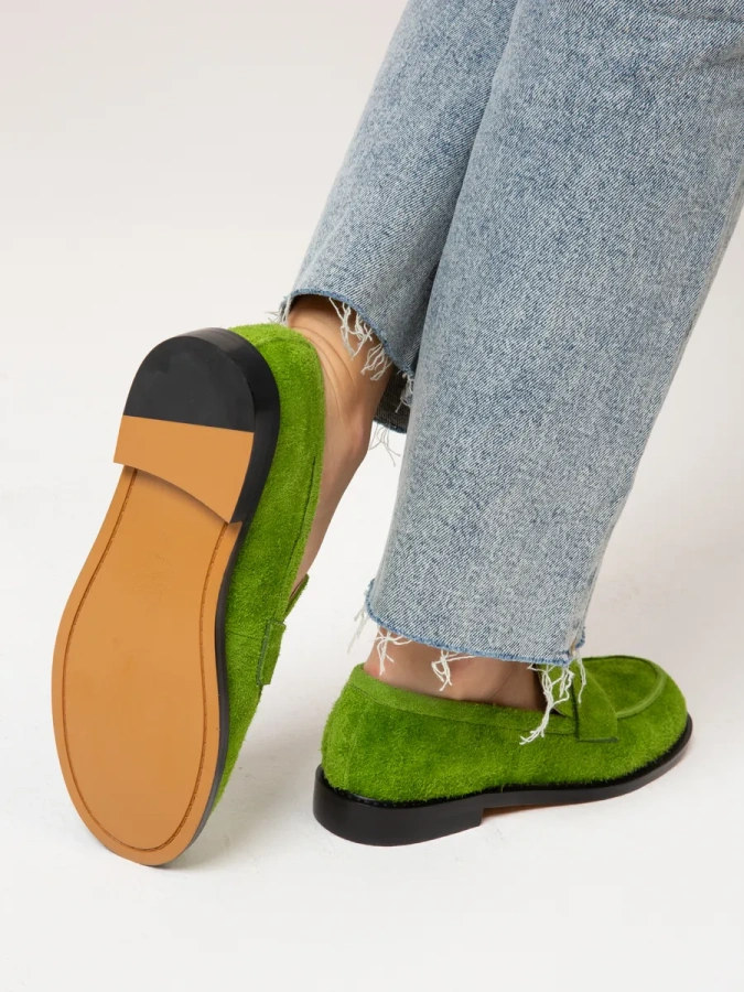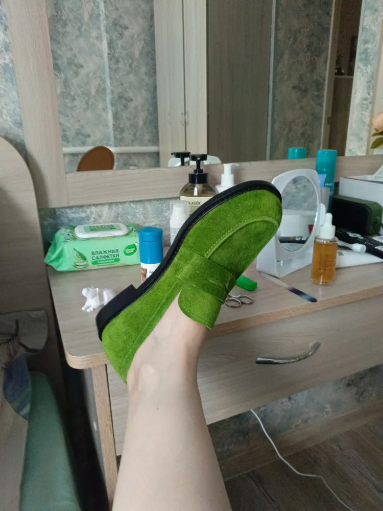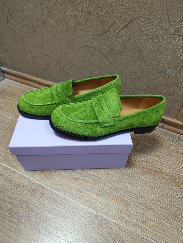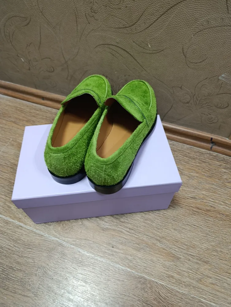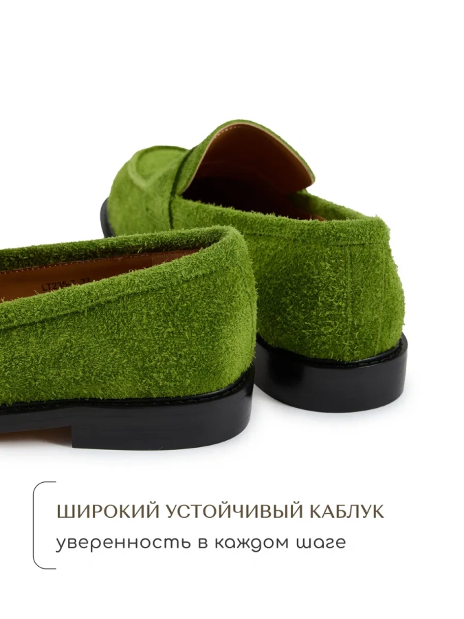 Изготовленные из 100% натуральной кожи (замши), они станут отличным дополнением к вашему образу в стиле casual. Зелёный цвет лоферов добавит яркости и свежести в ваш весенний гардероб. Удобная подошва из полиуретана и небольшой каблук высотой 2,5 см обеспечивают комфорт при ходьбе. Высота подошвы/платформы составляет 1 см, что придаёт обуви лёгкость и изящество.
