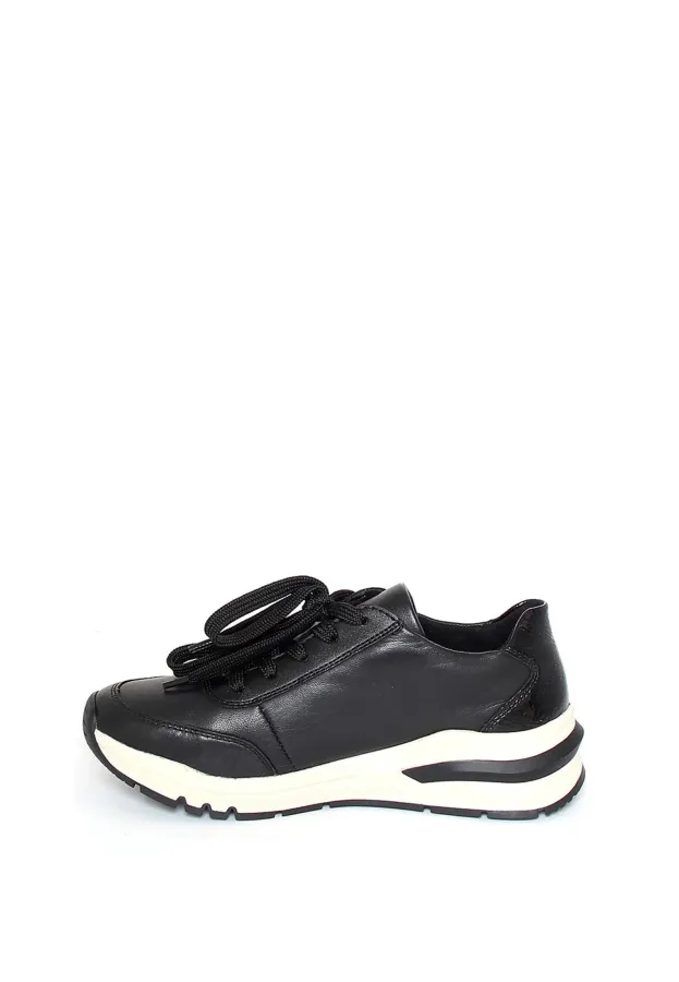 Чёрный цвет и высококачественная натуральная кожа делают их не только удобными, но и стильными. Осенняя коллекция 2025–2026 года порадует вас не только актуальным дизайном, но и высоким качеством материалов. Резиновая подошва обеспечивает отличное сцепление с поверхностью, а высота подошвы в 2 см и танкетка высотой 3 см делают модель удобной и комфортной для длительной носки. Шнуровка в сочетании с молнией обеспечивает надёжную фиксацию стопы. Кроссовки RIEKER — это сочетание стиля, качества и комфорта.