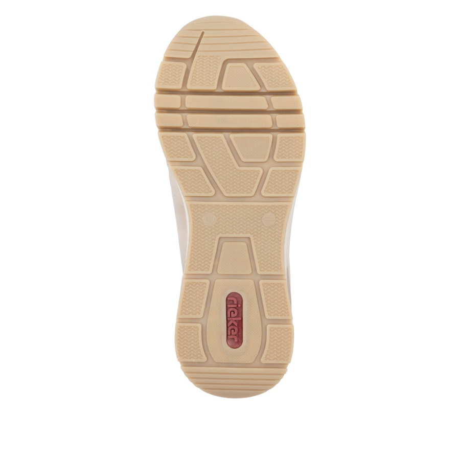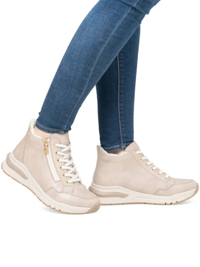 Кроссовки RIEKER — идеальный выбор для холодного времени года. Бежевый цвет и стиль sport-chic делают их универсальными для создания различных образов. Верх кроссовок выполнен из искусственной кожи, что обеспечивает их долговечность и устойчивость к износу. Подкладка из 100% натуральной шерсти гарантирует комфорт и сохранение тепла ваших ног в любую погоду. Текстильная стелька обеспечивает дополнительный комфорт при ходьбе. Резиновая подошва высотой 2 см обеспечивает хорошее сцепление с поверхностью, а танкетка высотой 4 см добавляет стильный акцент и удобство. Тип застёжки — шнуровка плюс молния, что обеспечивает надёжную фиксацию обуви на ноге.
