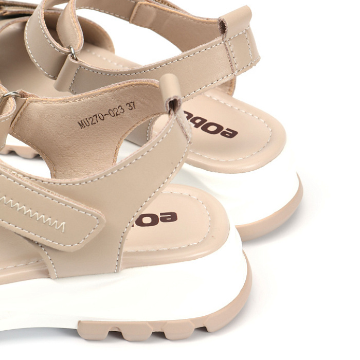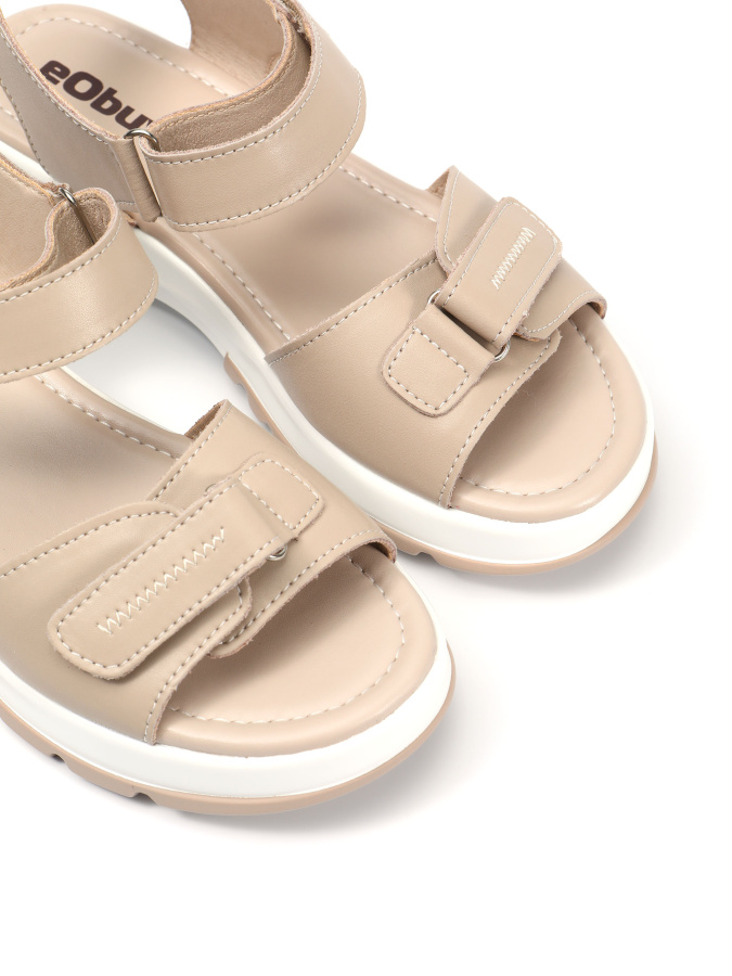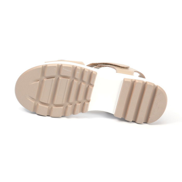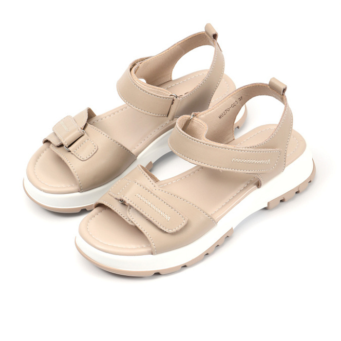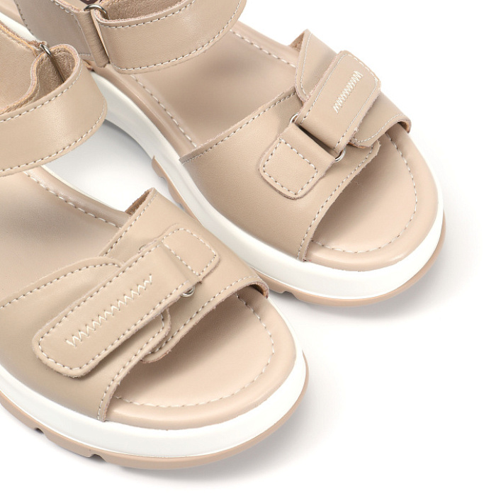 Бежевая натуральная кожа верха придаёт им изысканный и элегантный вид. Мягкая искусственная кожа подкладки обеспечивает комфорт и удобство при носке. Высота подошвы — 2,5 см, высота каблука — 4 см, при этом модель без лишних изысков в виде каблука позволяет чувствовать себя естественно и уверенно. Лёгкие и удобные сандалии на липучках идеально впишутся в ваш повседневный гардероб.