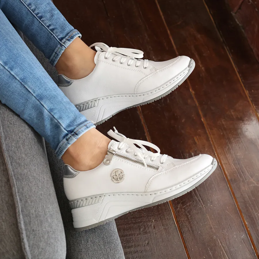 Женские кроссовки из натуральной кожи от бренда RIEKER. Главная отличительная черта обуви этого бренда - непревзойденное удобство и комфорт. Идеально подойдут на теплую весну. Подкладка из текстиля устойчива к износу и хорошо вентилируются. Мягкая стелька из натуральной кожи придает дополнительный комфорт стопе. Завышенная подошва на танкетке обладает отличной амортизацией и хорошим сцеплением с поверхностью. Сочетание шнуровки и молнии облегчает процесс обувания и позволяет регулировать подъем. Удобная колодка адаптирована под женскую стопу и длительную носку. Подходят на стандартную полноту стопы и небольшой +/-.