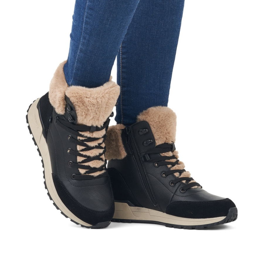 Обретите элегантность и комфорт с женскими ботинками RIEKER из коллекции Осень-Зима 2023-2024. Черные ботинки, разработанные в Швейцарии, представляют собой воплощение стиля и функциональности для зимних дней.