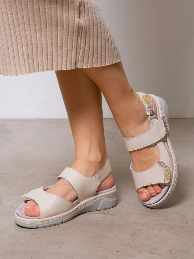 Изготовленные из 100% натуральной кожи, сочетают в себе комфорт и долговечность. Их нежный молочный оттенок легко впишется в любой повседневный образ, добавляя стиля и элегантности. Высота подошвы в 2 см и каблука на танкетке в 4,5 см обеспечивает удобство и поддержку, а липучки делают надевание и снятие легким. С этими сандалиями Donna Daniella вы создадите уникальные летние образы и будете наслаждаться каждым днем!