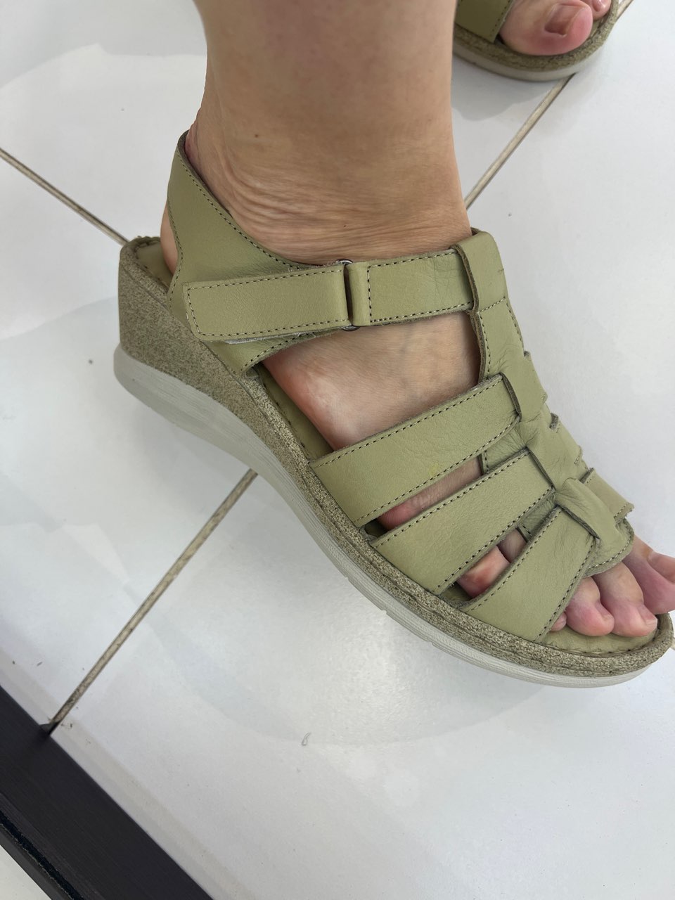Изготовленные из 100% натуральной кожи, они обеспечивают комфорт и долговечность. Танкетка высотой 6 см и подошва из ТПР (термопластичной резины) обеспечивают удобную посадку и надёжность. Липучка в качестве застёжки делает босоножки лёгкими в использовании и обеспечивает надёжную фиксацию. Высота подошвы — 2,5 см — добавляет лёгкости и удобства в носке. Выполненные в цвете хаки, они гармонично впишутся в ваш casual-гардероб.