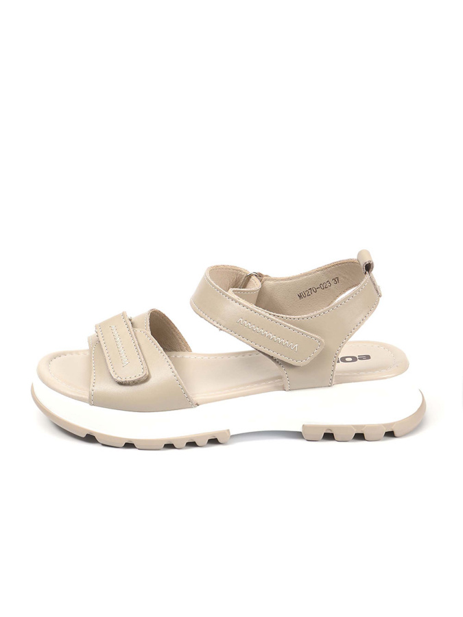 Бежевая натуральная кожа верха придаёт им изысканный и элегантный вид. Мягкая искусственная кожа подкладки обеспечивает комфорт и удобство при носке. Высота подошвы — 2,5 см, высота каблука — 4 см, при этом модель без лишних изысков в виде каблука позволяет чувствовать себя естественно и уверенно. Лёгкие и удобные сандалии на липучках идеально впишутся в ваш повседневный гардероб.