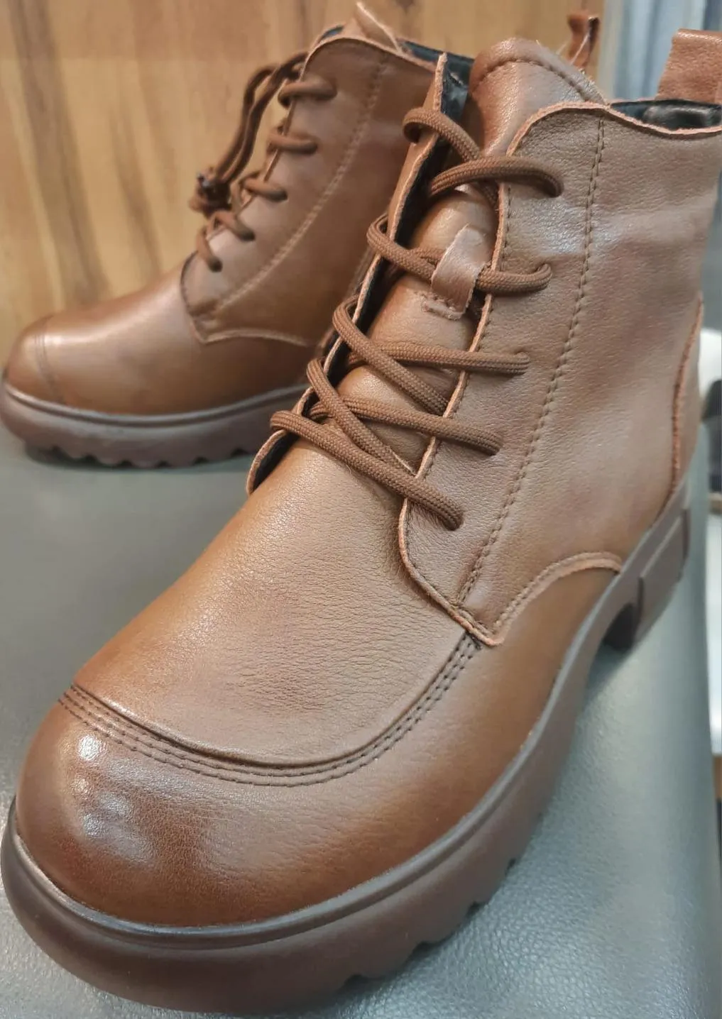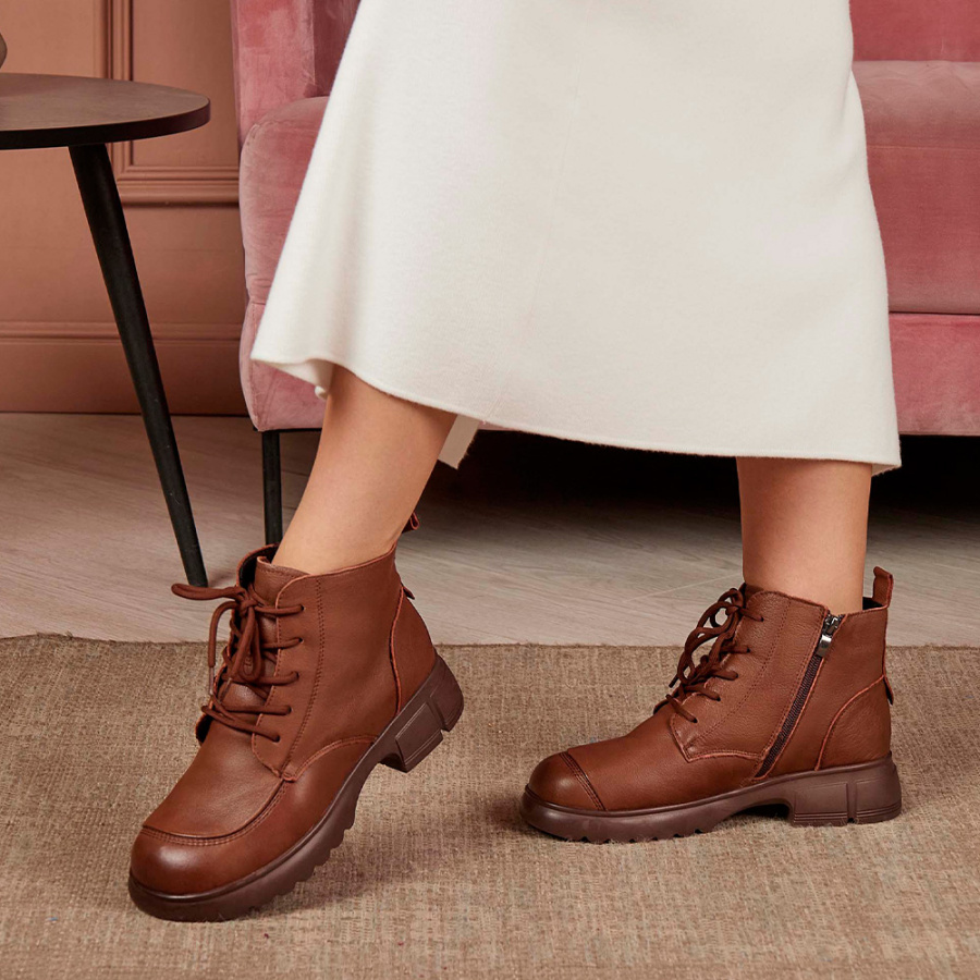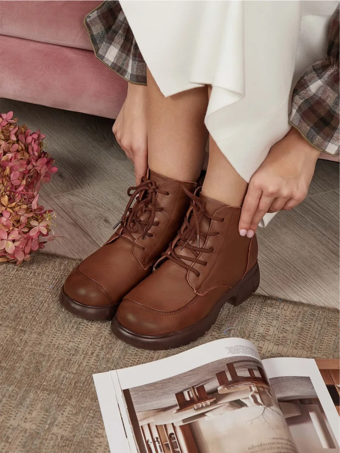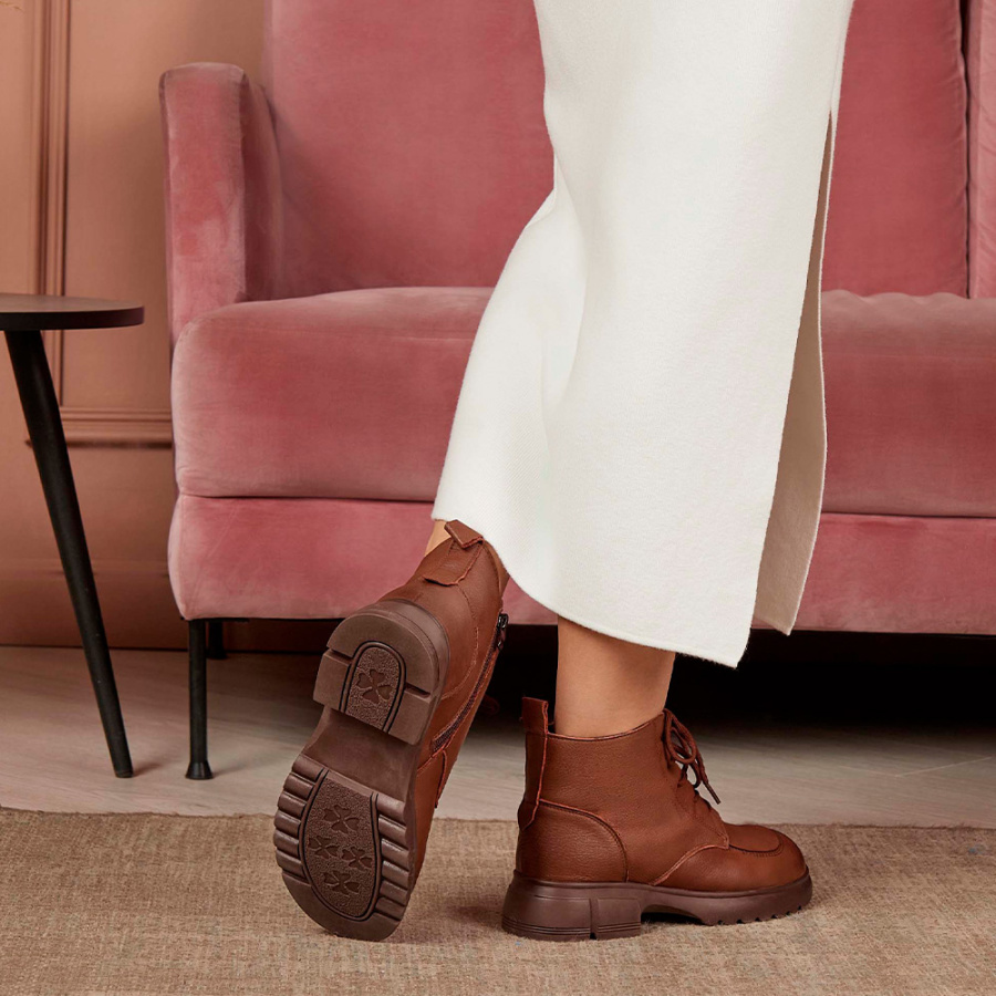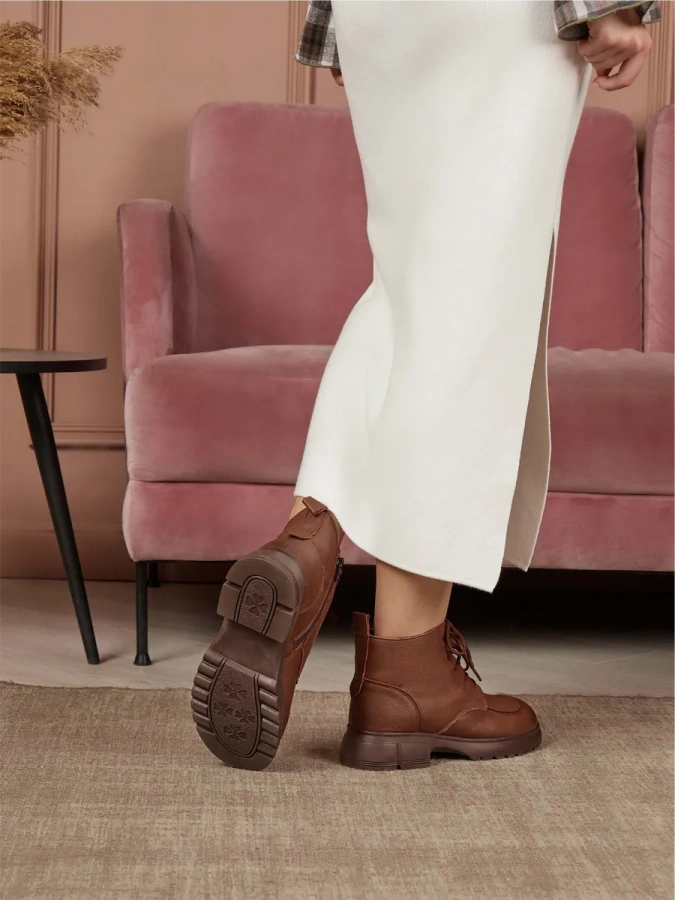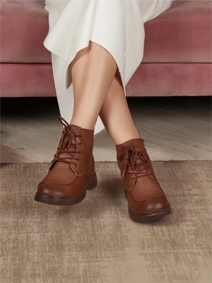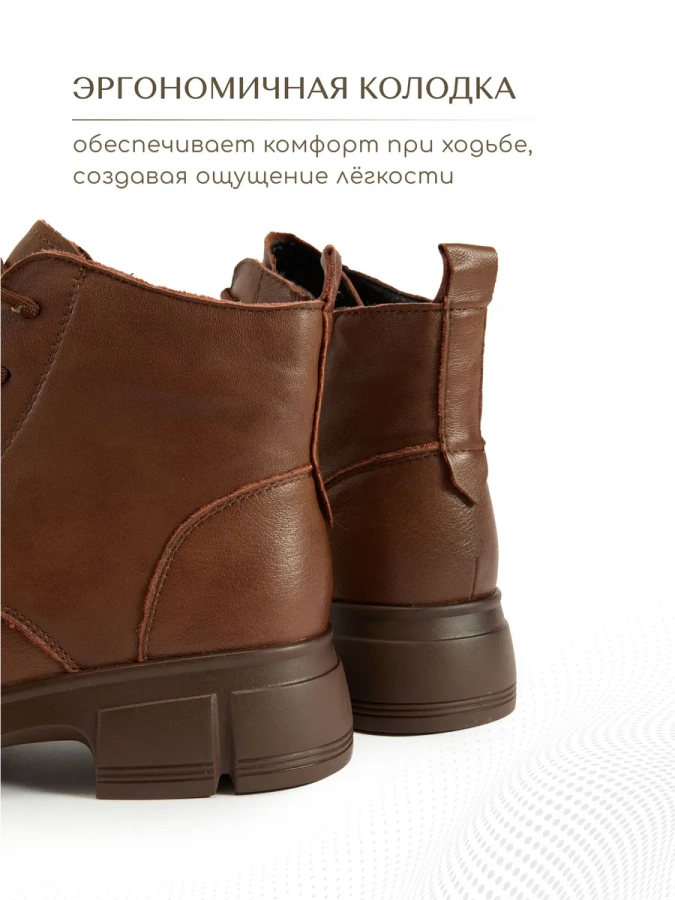 Модель изготовлена из 100% натуральной кожи, что обеспечивает её долговечность и элегантный внешний вид. Коричневый цвет делает эти ботинки универсальным дополнением к гардеробу, подходящим для различных образов в стиле casual. Тёплая шерстяная подкладка и стелька создают комфорт и уют в любую погоду, а высота подошвы в 2,5 см и каблука в 4,5 см придают модели изящный и современный вид. Шнуровка в сочетании с молнией обеспечивает надёжную фиксацию обуви на ноге. Отличный выбор для холодного времени года.