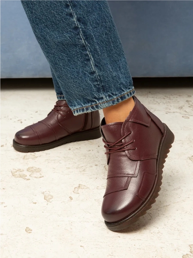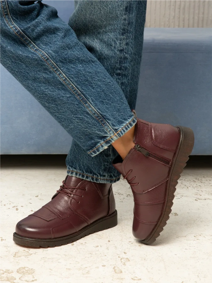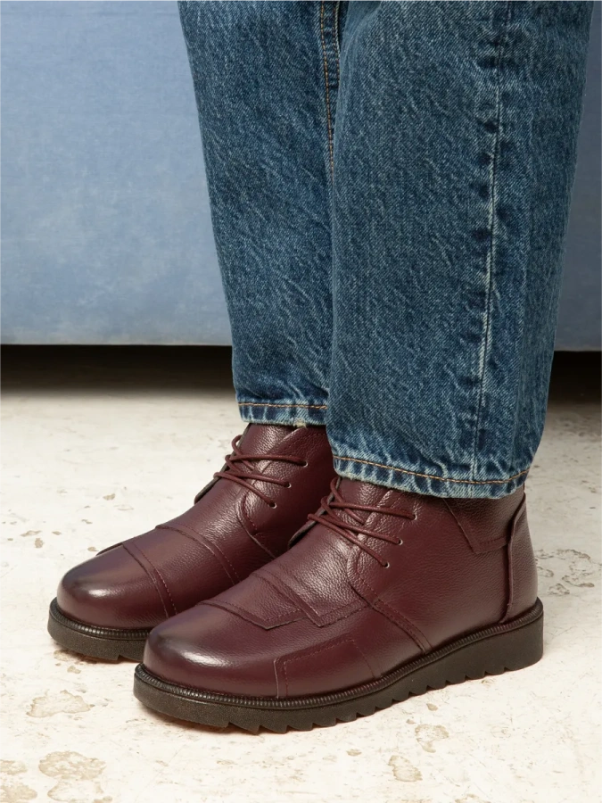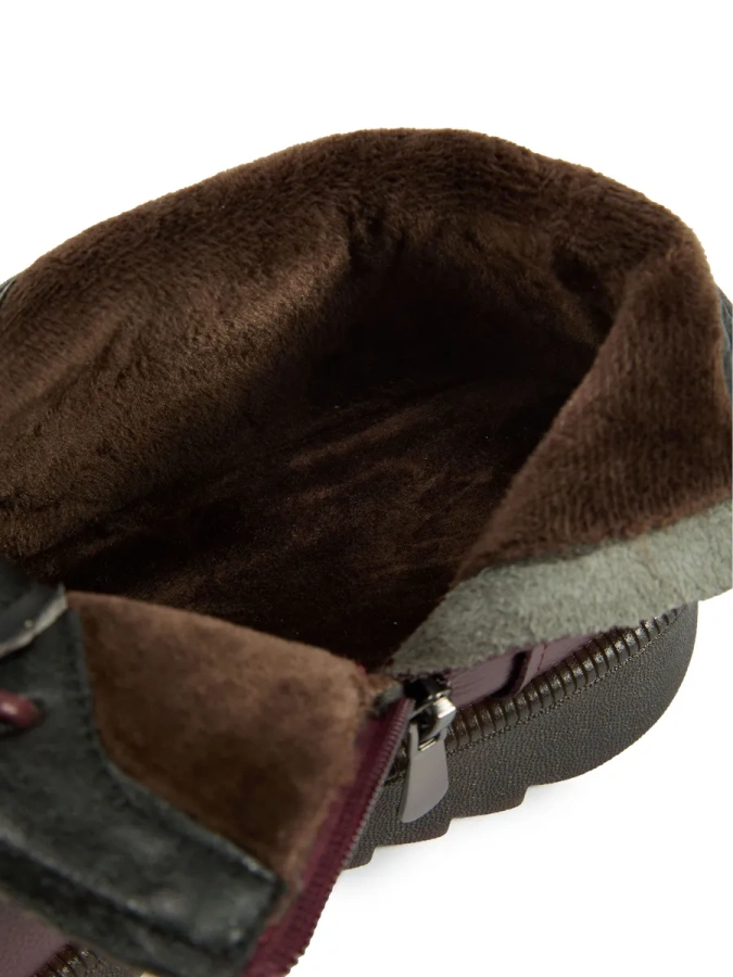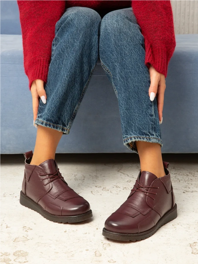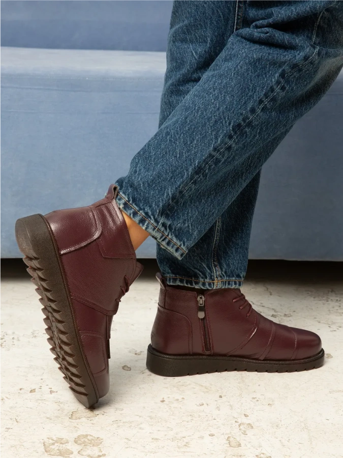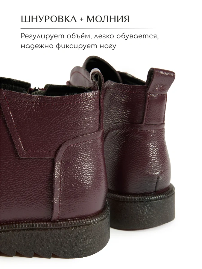 Модель изготовлена из 100% натуральной кожи, что обеспечивает её долговечность и привлекательный внешний вид. Высота подошвы в 1,5 см и аккуратный каблук в 3 см делают модель удобной и стильной. Шнуровка и молния обеспечивают надёжную фиксацию и комфорт при ходьбе. Подкладка и стелька из байки сохраняют тепло в прохладную погоду.