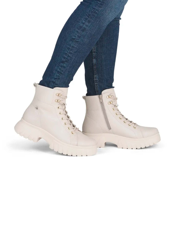 Женские ботинки RIEKER бежевого цвета — отличный выбор для осени. Натуральная кожа верха обеспечивает долговечность и комфорт. Тёплая подкладка из ворсина и текстильная стелька создают уют и поддерживают тепло. ЭВА подошва гарантирует лёгкость и амортизацию при ходьбе. Стиль casual делает эти ботинки идеальными для повседневного образа. Удобная шнуровка в сочетании с молнией обеспечивает надёжную фиксацию.