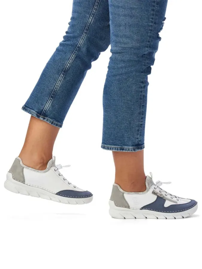 Женские кроссовки из натуральной кожи со вставками из искусственного материала от бренда RIEKER. Главная отличительная черта обуви этого бренда - непревзойденное удобство и комфорт. Идеально подойдут на весну. Подкладка из текстиля устойчива к износу и хорошо вентилируются. Мягкая стелька из натуральной кожи придает дополнительный комфорт стопе. Боковая молния декоративная. Облегченная подошва обладает повышенной амортизацией и хорошим сцеплением с поверхностью. Удобная колодка адаптирована под женскую стопу и длительную носку, а наличие резинки с фиксатором в качестве шнуровки облегчает процесс обувания. Подходят на стандартную полноту стопы и небольшой +/-