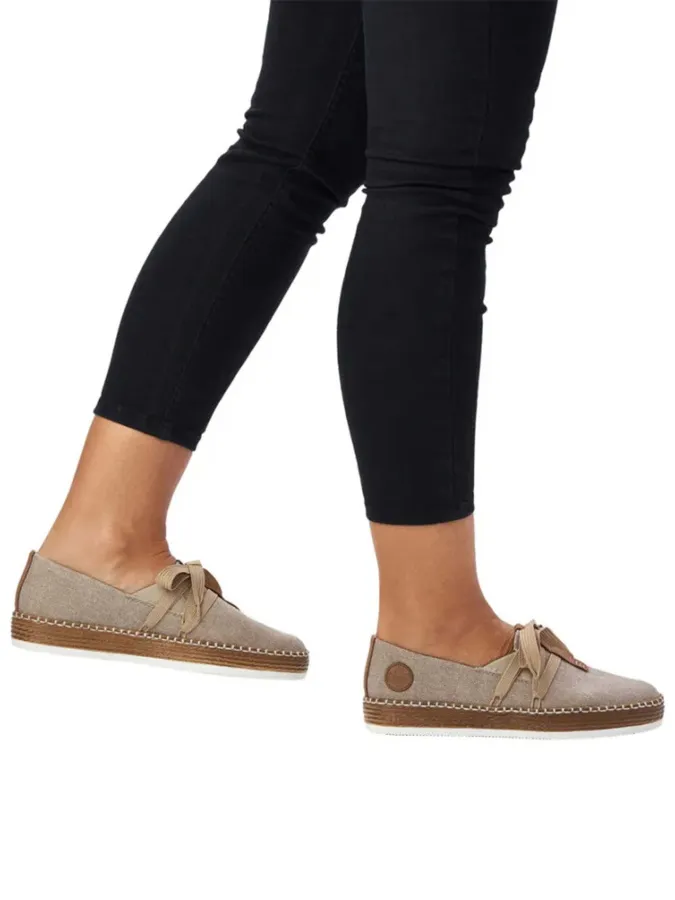 Женские текстильные эспадрильи от немецкого бренда Rieker. Главная отличительная черта обуви этого бренда - непревзойденное удобство и комфорт. Мягкая кожаная стелька поддерживает и амортизирует стопу. Облегченная подошва с имитацией под джут обладает повышенной амортизацией и хорошим сцеплением с поверхностью. Удобная колодка адаптирована под женскую стопу и длительную носку, а наличие боковых стрейчевых вставок облегчает обувание. Шнуровка декоративная. Подходят на стандартную полноту стопы и небольшой +/-